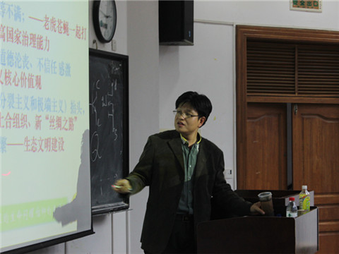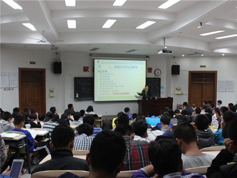 讲座在新生们热烈的掌声中开始。常亮老师首先就“大学生为何要入党”这一问题进行分析。他指出:时下大学生入党俨然成为一种“潮流”。接着,常亮老师从“青年学生的入党动机分析”、“生无信仰心、恒被他笑具”、“最新时事动态解读” 、“如何成就自己的信仰”以及“组织发展入党程序”五部分做了详解。他对当前大学生五种不同的入党动机进行了深入透彻的分析,讲解了信仰的重要性和两种科学解读“共产主义信仰”的方法。又结合“香港占中”、“马航MH 370”等最新时事,从我国当前的国情、不足与矛盾、周边形势、国际形势背景等方面对时事动态进行了解读。而在分析国际形势背景时,常亮老师指出:中美矛盾核心根源在于意识形态之争,本质则是经济利益之争。同时向新生们介绍了入党的流程以及申请入党人、入党积极分子、发展对象之间的区别与联系,并向新生们阐述了入党申请书的一些必要规范和细节。期间、他还为新生们讲述了自己在朝鲜时的见闻,幽默诙谐的语言使学生们多次爆发出热烈的掌声。
